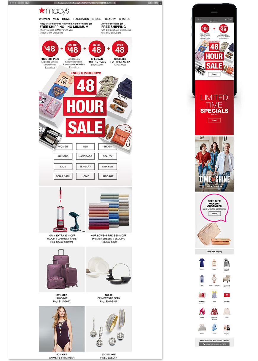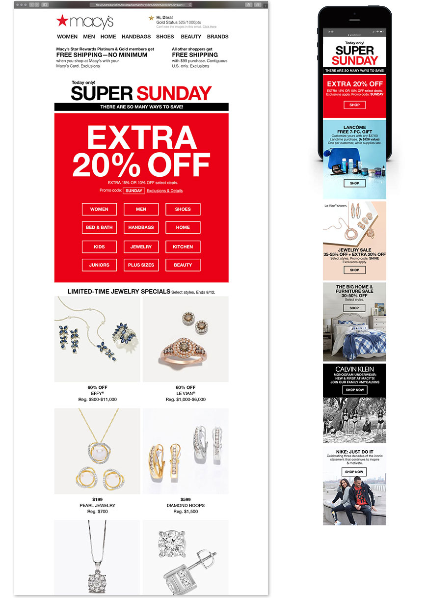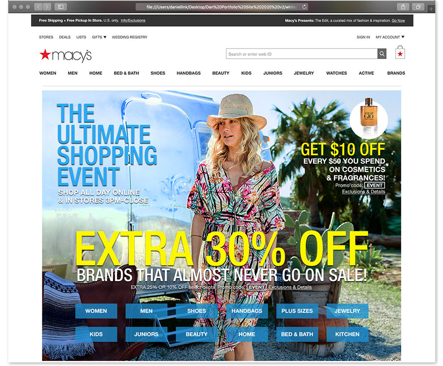 For the past few years, I have had the honor and priviledge of joining the Macy's marketing organization as a web and interactive designer. During my tenure, I have been part of teams that created omnichannel experiences for all their campaigns. By coordinating with print, web, and social teams, I was able to create cross-channel content to improve Macy's user experience and drive better relationships with their audience across points of contact. Assets such as homepages, emails, banners, sitelets and affiliate ads for both desktop and mobile viewing. I have also been tasked to assist with print assets, too.